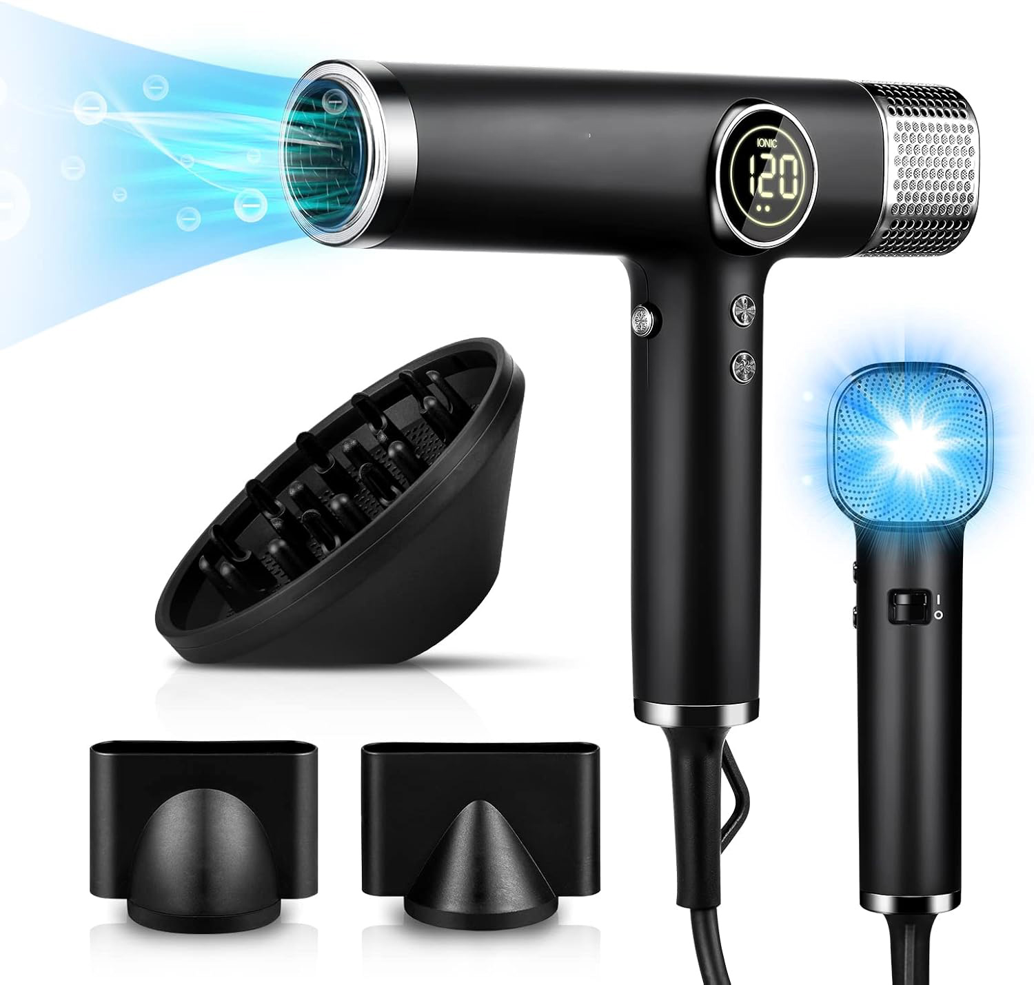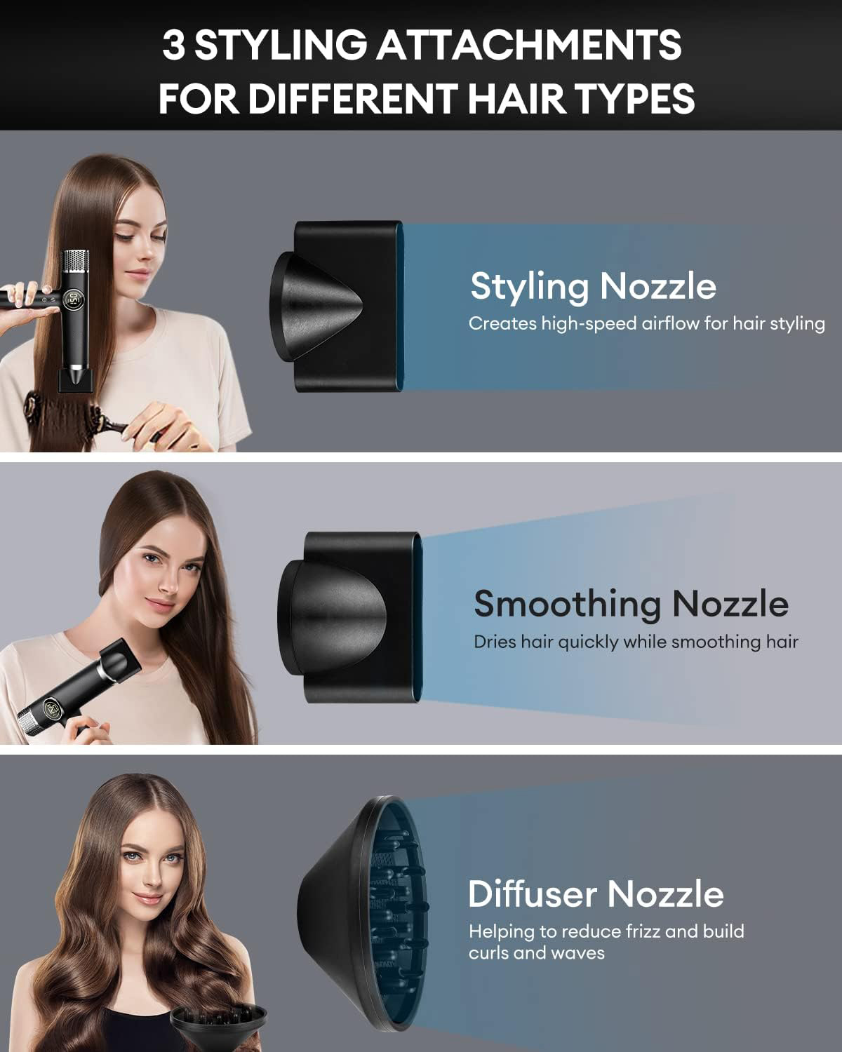 Comes with multiple magnetic attachments (concentrator nozzle / diffuser), easy to attach and remove, secure during use, and ideal for creating straight, curly, or voluminous styles.