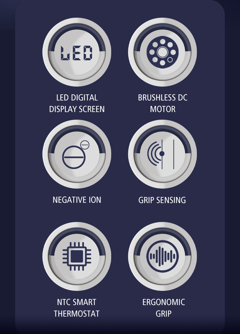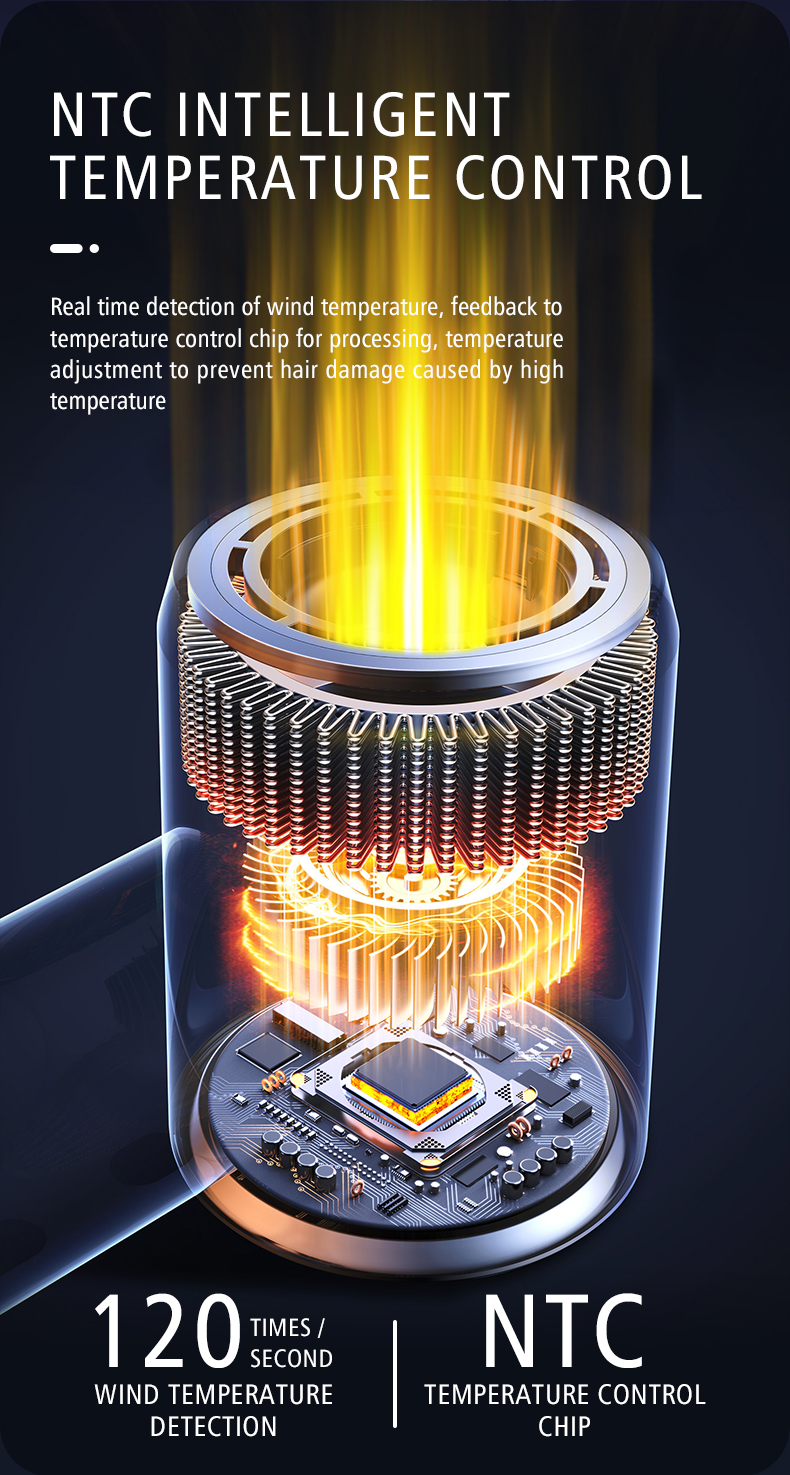 Built-in smart temperature control system monitors air temperature multiple times per second, preventing overheating and hair damage while effectively reducing frizz and split ends.