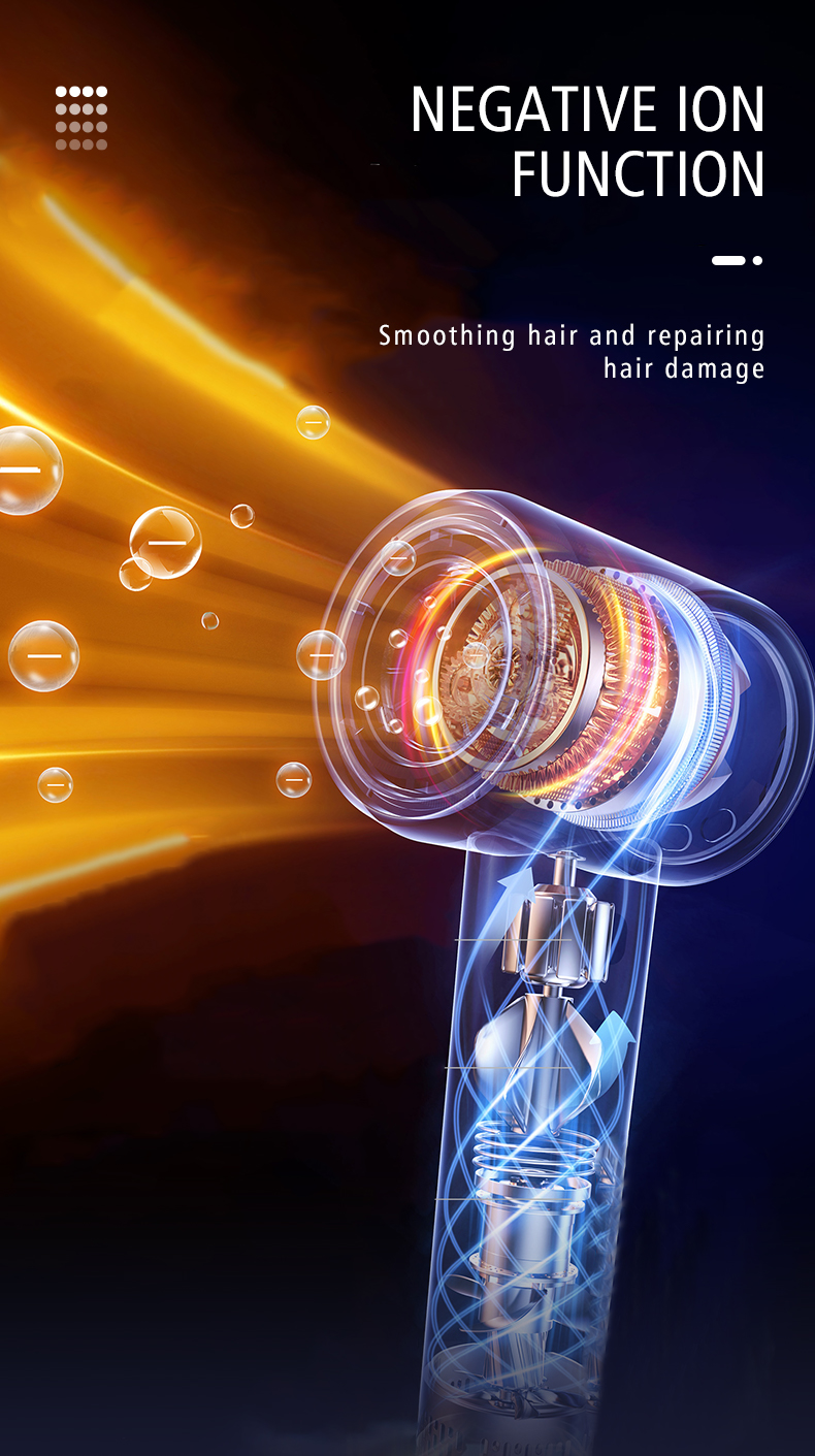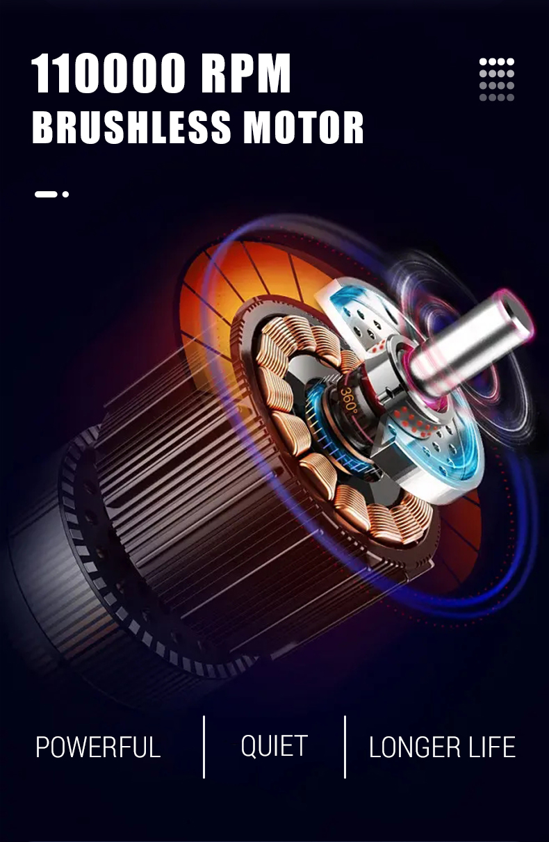 Equipped with a high-speed brushless motor with a rotational speed of over 100,000 RPM, delivering more concentrated and powerful airflow for fast drying, significantly reducing drying time.
