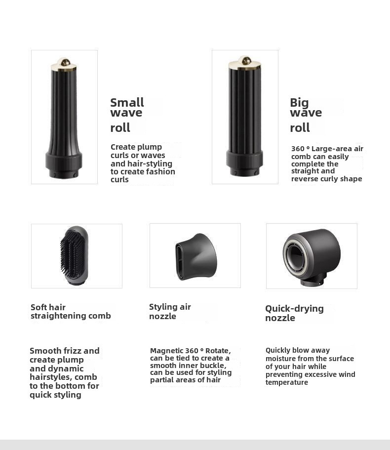 Comes with various magnetic or snap-on attachments such as smoothing brushes, curling barrels, styling nozzles, and diffusers for quick and easy replacement.