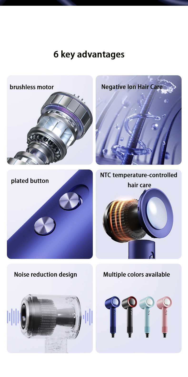 Offers multiple combinations of airflow speeds and temperature levels to suit different hair types and styling needs—drying, styling, and hair care all in one device.